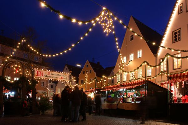 Zur Weihnachtszeit verwandelt sich Nördlingen in ein festlich beleuchtetes Winteridyll: Lichterglanz an historischen Fassaden und der Weihnachtsmarkt mitten in der Altstadt laden zum Verweilen ein.