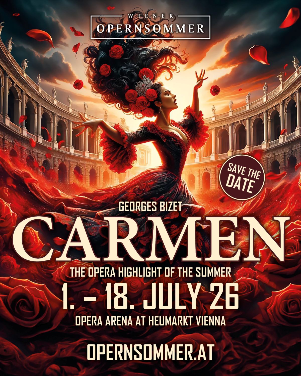 Vom 1. bis 18. Juli 2026 verwandelt sich die Opernarena am Heumarkt in eine Bühne voller Leidenschaft, Musik und Dramatik: Erleben Sie Georges Bizets weltberühmtes Meisterwerk „Carmen“.
